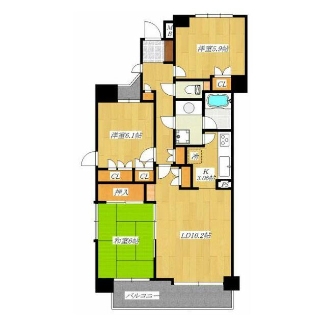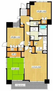| 間取り | 3LDK(洋室5.9 洋室6.1 和室6 LD10.2 K3) | 主要採光面 | 南東 |
