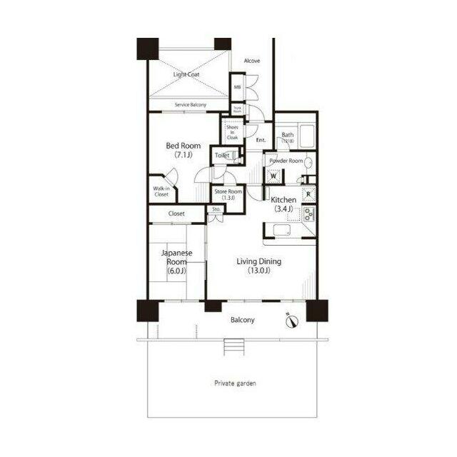 | 間取り | 2LDK(LD13 K3.4 洋室7.1 和室6 納戸1.3) | 主要採光面 | 南西 |